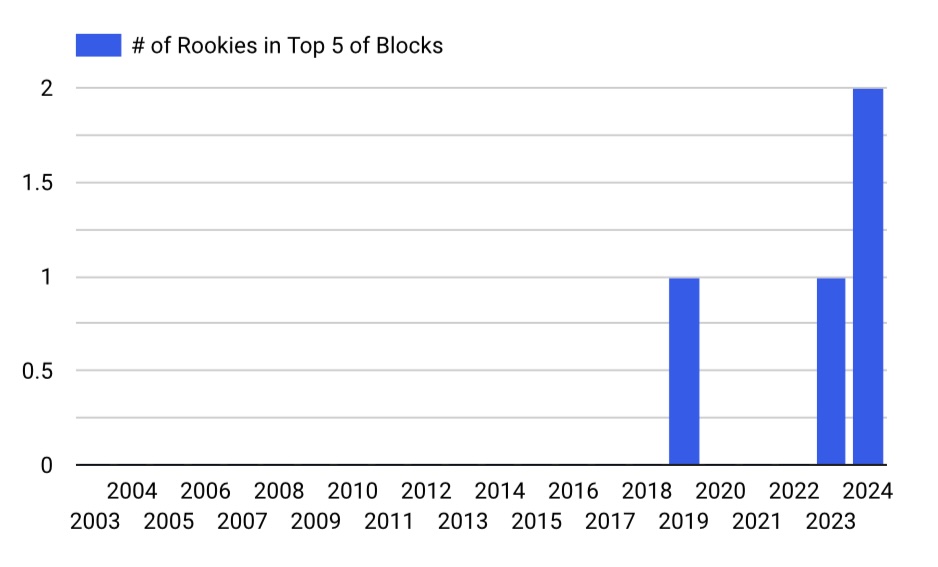 The idea of a rookie ranking in the top 5 of blocks is not completely foreign. Mitchell Robinson accomplished the feat in 2018–19. Clearly this is not a common occurrence.